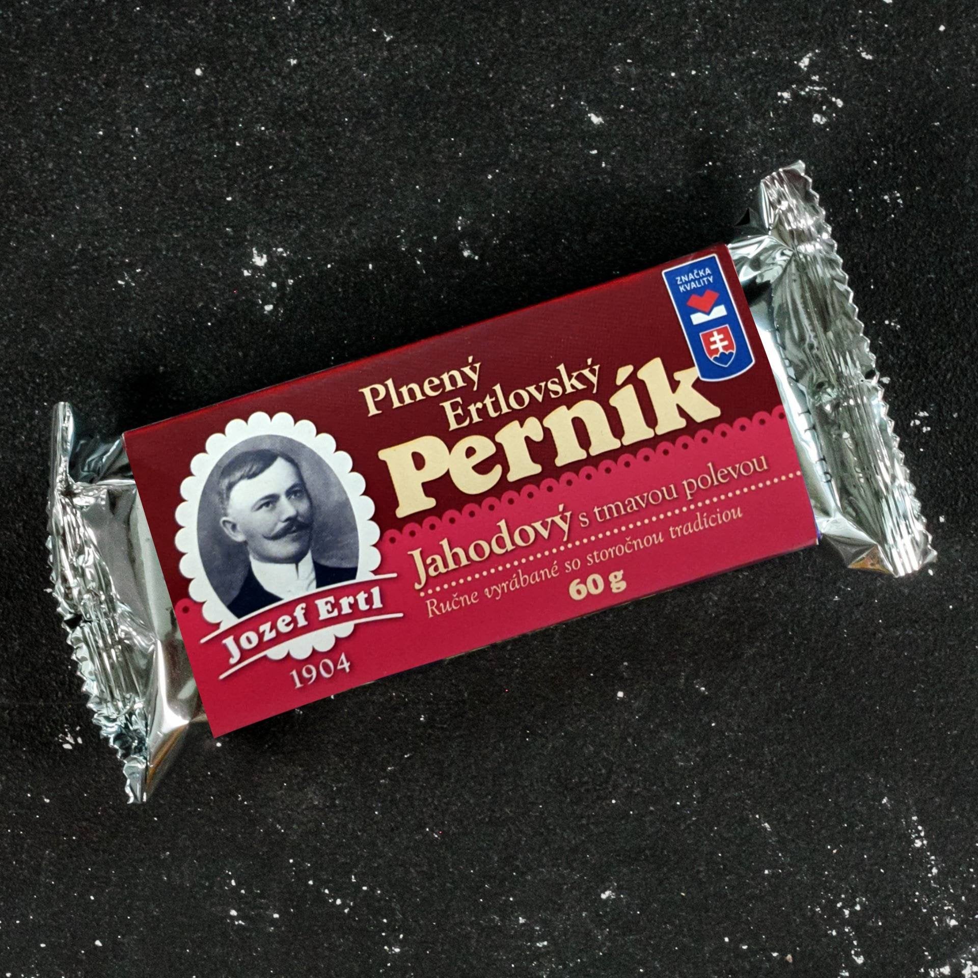 Ručne vyrábaný a plnený perník s jahodovou náplňou a tmavou polevou. Perníková tradícia ERTLOVCOV: Tovariš Jozef Ertl sa v roku 1904 usadil v Prievidzi, rodisku svojho otca, kde začal piecť prvé perníky podľa vlastnej receptúry. V rodinnej tradícii pokračuje už štvrtá generácia Ertlovcov a lahodné perníky pre Vás s láskou pečú dodnes.
